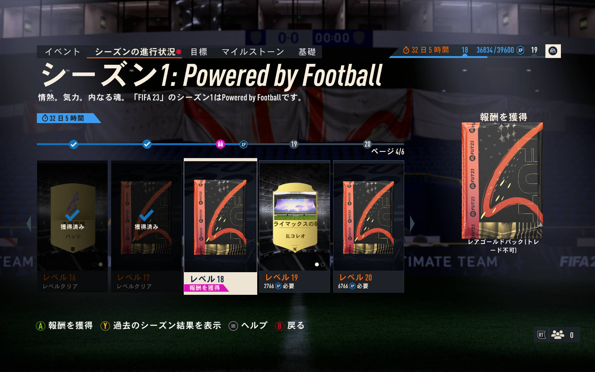 シーズンの進行状況レベル18。報酬はレアゴールドパック。