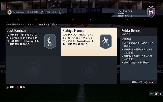 ダイナミックデュオの第2弾。今回はジャック・ハリソンとロドリゴ・モレノ・マチャド。どちらも報酬はそれぞれのトレ不可OVR84。パスかな。コンプリート報酬はトレ可プレミアムゴールドパック。