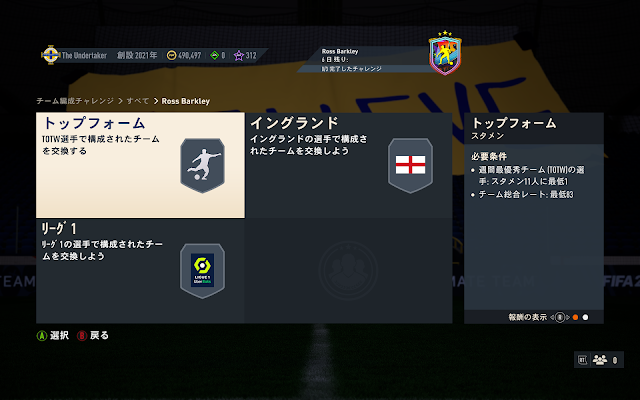 SBC Ross Barkley。期限は7日。報酬はそれぞれ、スモールエレクトラム選手パック、ミックス選手パック、プライムミックス選手パック。完了報酬はOOP86ロス・バークリーの2選手ピック。片方はCFでポジション変更不可、片方はRWでRM/CMコンバート可能。だったら1択な気がする。無茶苦茶難しくもないが、そこまでしてほしいかと言われれば、キエーザほど欲しくはない。