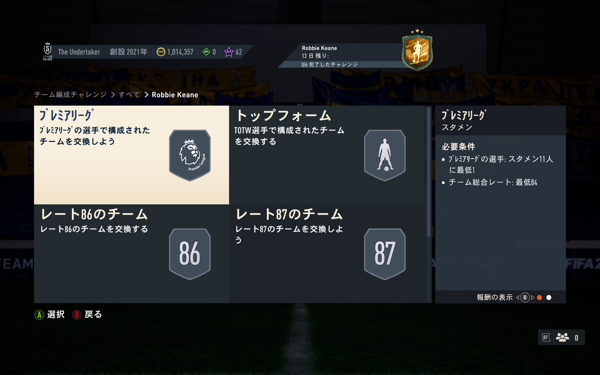 SBC Robbie Keane。期限は14日。報酬はそれぞれ、トレ可プレミアムゴールドパック、トレ可ジャンボプレミアムゴールドパック、トレ可プレミアムゴールド選手パック、トレ可プライムゴールド選手パック、トレ可レア選手パック、トレ可レアメガ選手パック。完了報酬がワールドカップFUTヒーロー88ロビー・キーン。コスト高い。パス。