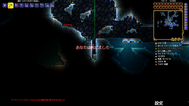 今日はディアクロップスを倒すところから始めようと、縦穴掘ってスノーフリンクスを探しに来たが、アイテムがいっぱいになっていったん帰還。戻ってきてツタのロープを降りていたつもりだったが、途中からロープ設置してなかったの忘れててそのまま落下死。無念。261回目の死亡。